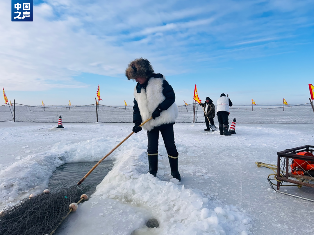 渔把头识冰的功夫,来自师傅,也来自岁月。张文一对眼,看定了冬捕范围,两名渔工手扶20多公斤重的冰镩,在近1米厚的冰面上开凿磨盘大的洞。冬捕运转了。