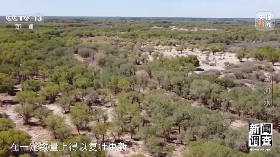 因为有了黑河抓续20多年的补水,额济纳境内胡杨林在一定数目上得以复壮更新,胡杨林面积由24年前的30万亩增多到了如今的45万亩。